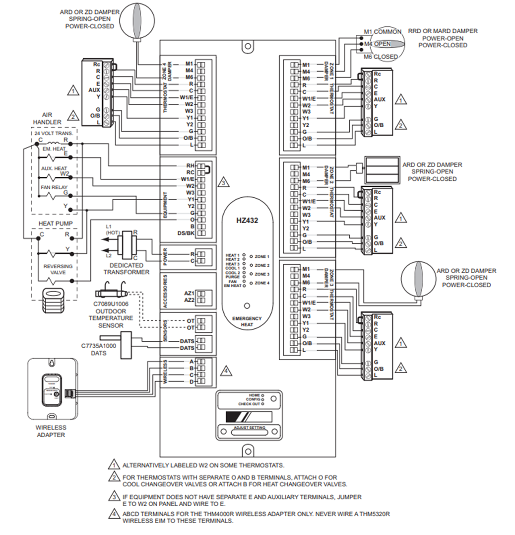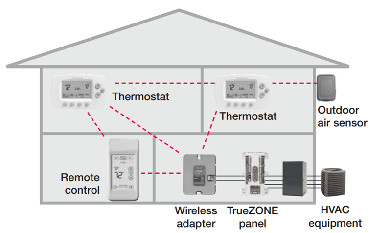 See below sample connection set up with the true zone panel for heat pump, 2-heat/1-cool with electric auxiliary heat.
